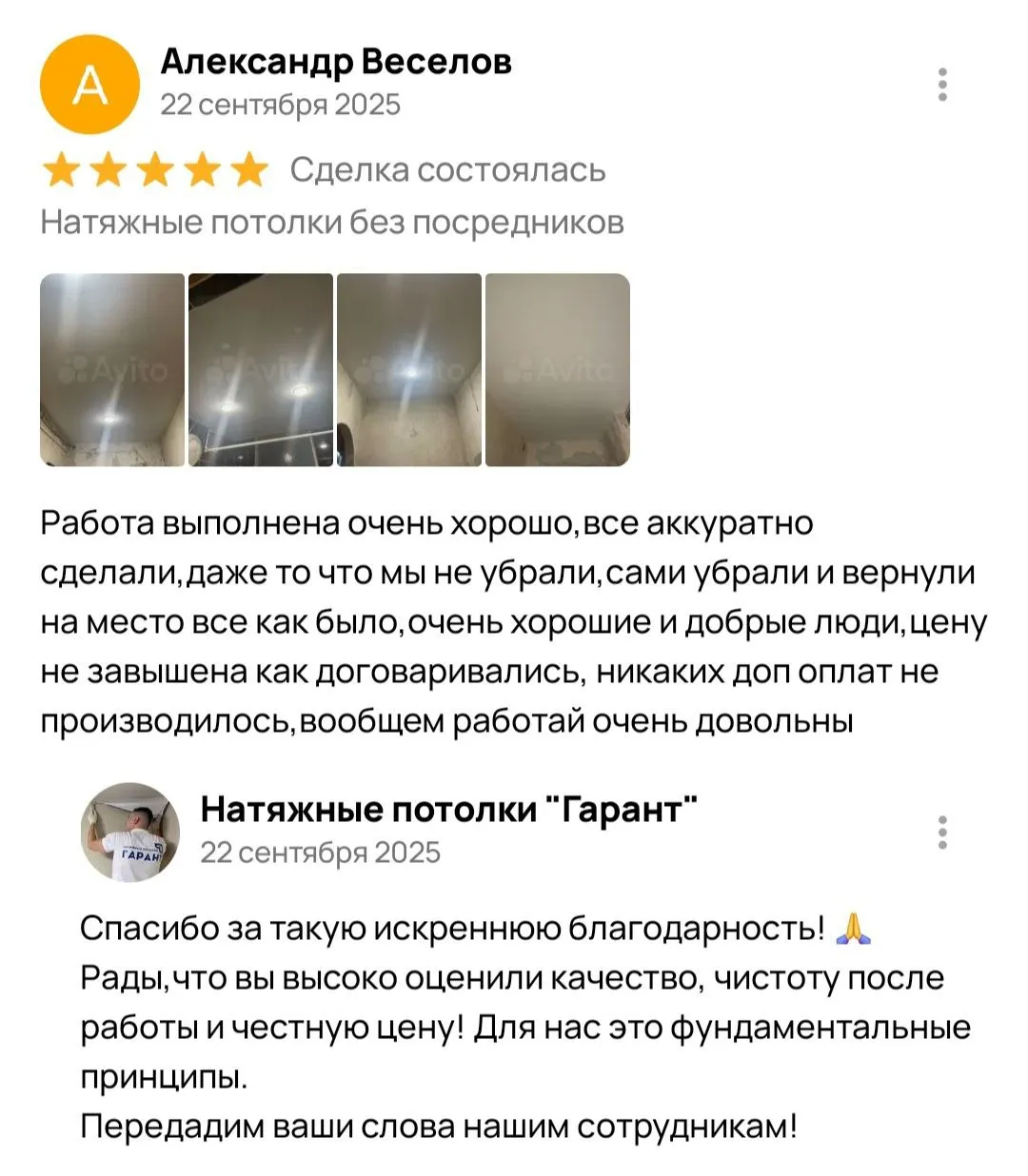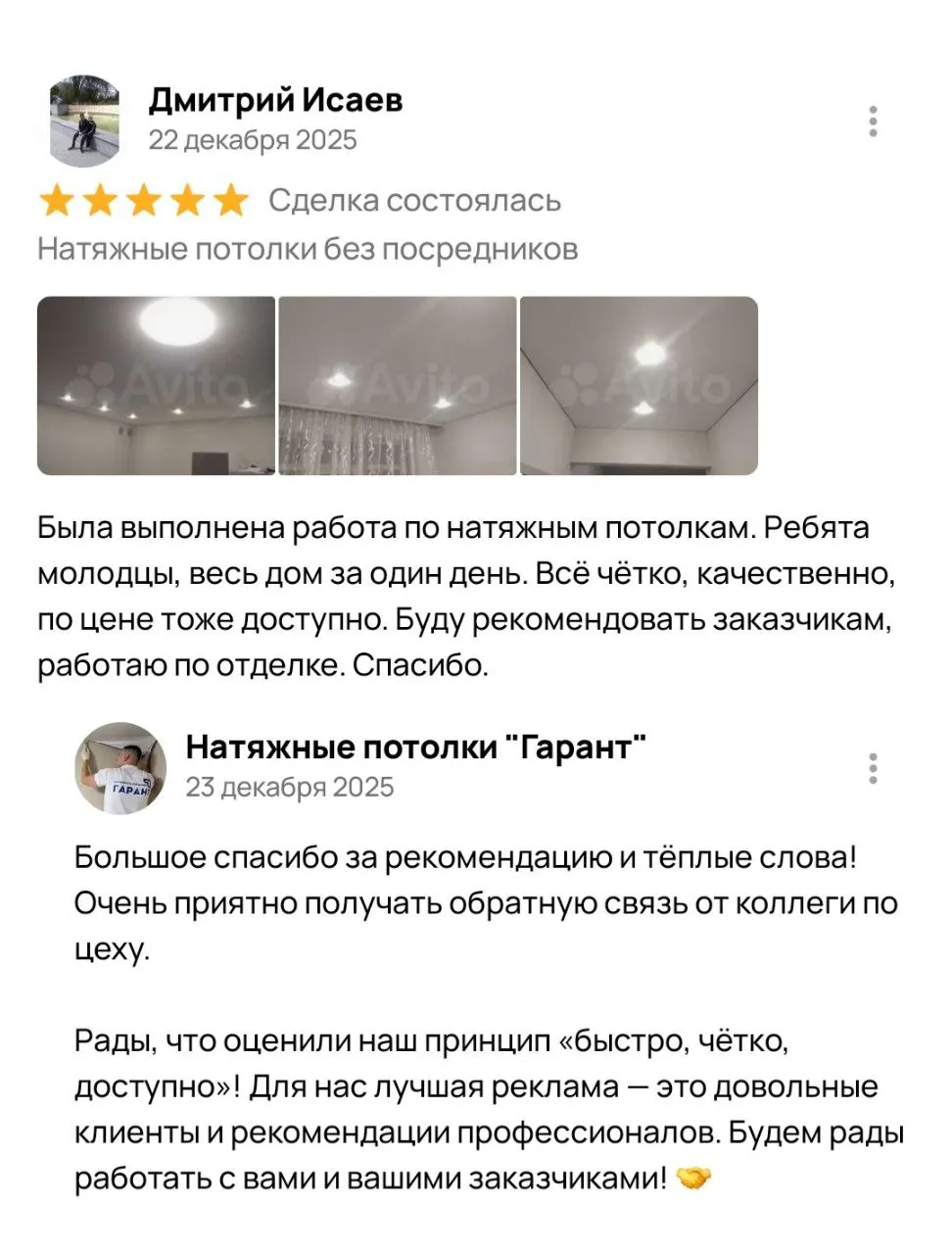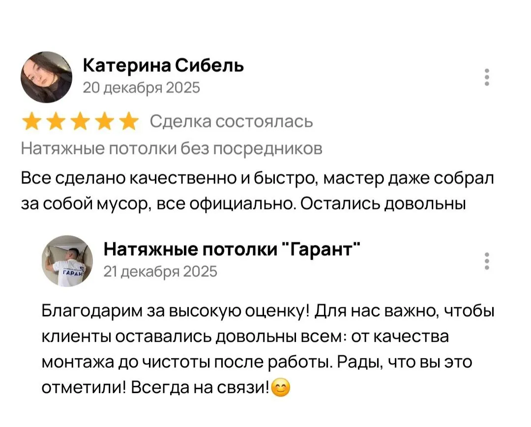 Монтаж за 1 день | 2-й потолок в подарок | Сервис бесплатно | Потолки от производителя | Чистый монтаж с пылесосом | Работа по договору с гарантией 15 лет |